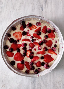 Într-o tavă tapetată cu hărtie de copt sau într-o formă de copt torni compoziția și nivelezi cu o lingură sau o spatulă. Direct în tavă, peste compoziția deja turnată, adaugi fructele din loc în loc.